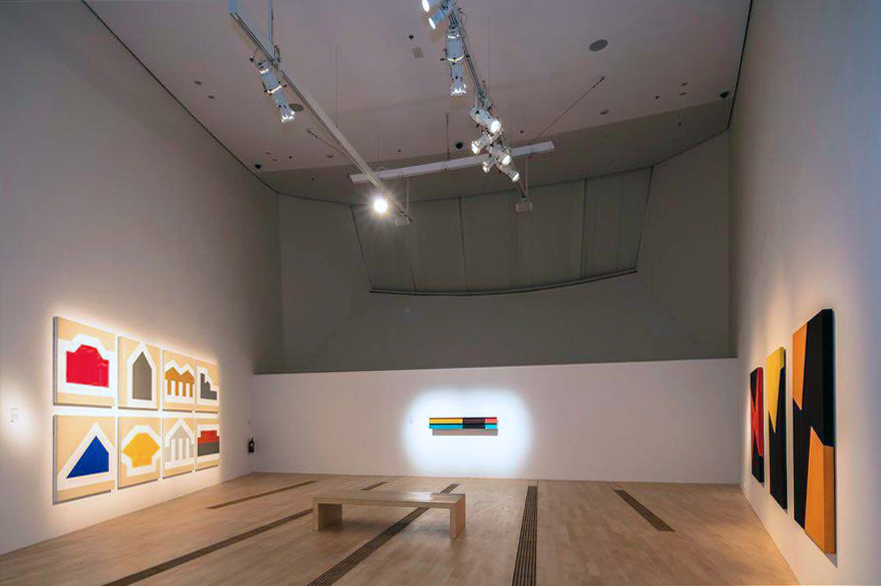 Chen Shiau-Peng (left), Donald Judd (middle), Carmen Herrera (right) and Jeremy Sharma (sound) showing in the Color and Form gallery in Minimalism: Space. Light. Object. at ArtScience Museum, Singapore.